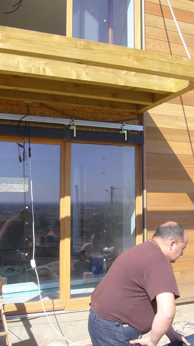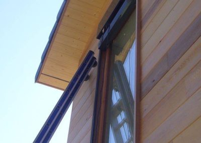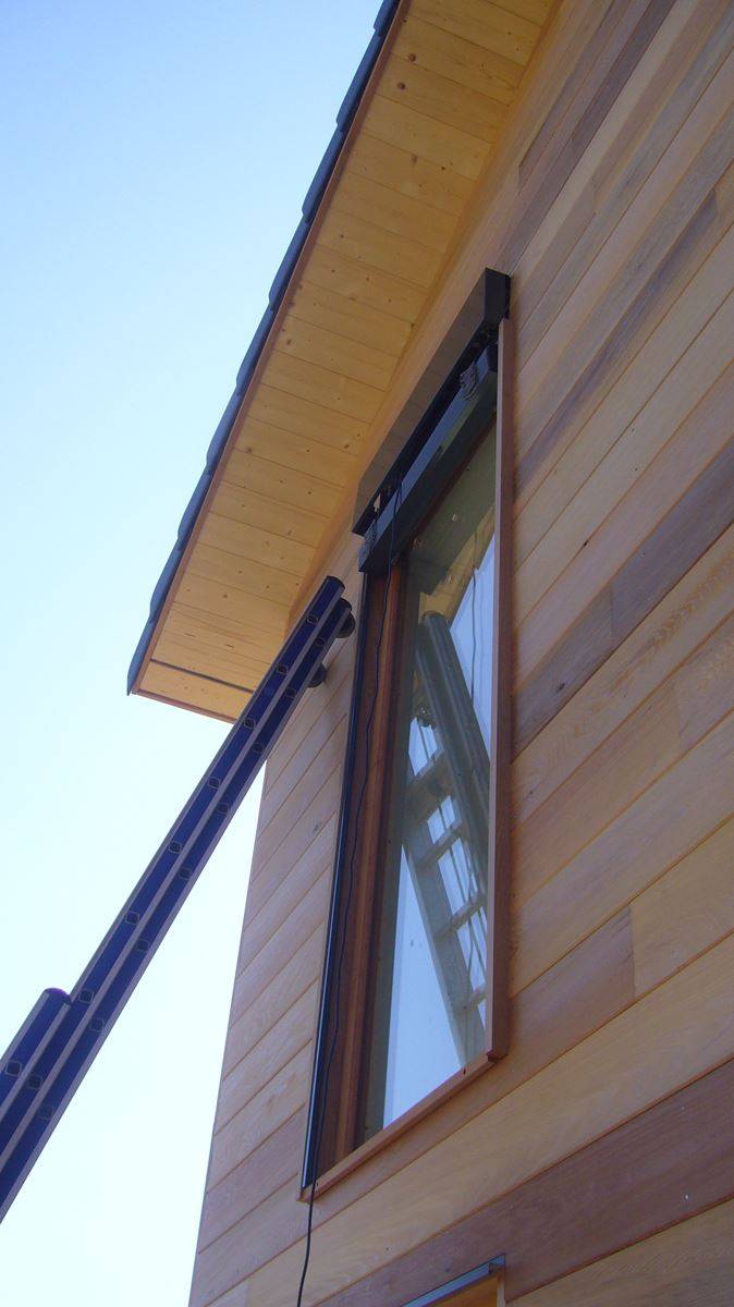 Elle est isolé entièrement en fibre de bois, les grandes ouvertures sont équipées de brises soleil orientables pour réguler l’apport solaire. Le bardage est en red Cedar premium.